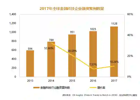 全球金融科技企业融资案例数量近五年呈现增长态势, 2014、2015年增长幅度分别达到32.66%、20.69%。 2017年全球金融科技企业共发生融资案例数1128起, 同比增长10.26%。