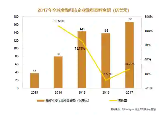 全球金融科技企业融资案例金额近五年整体上同样呈现增长态势, 从2013年的38亿美元增长到2017年的166亿美而且达到近五年的最高值, 增幅达到336.84%。