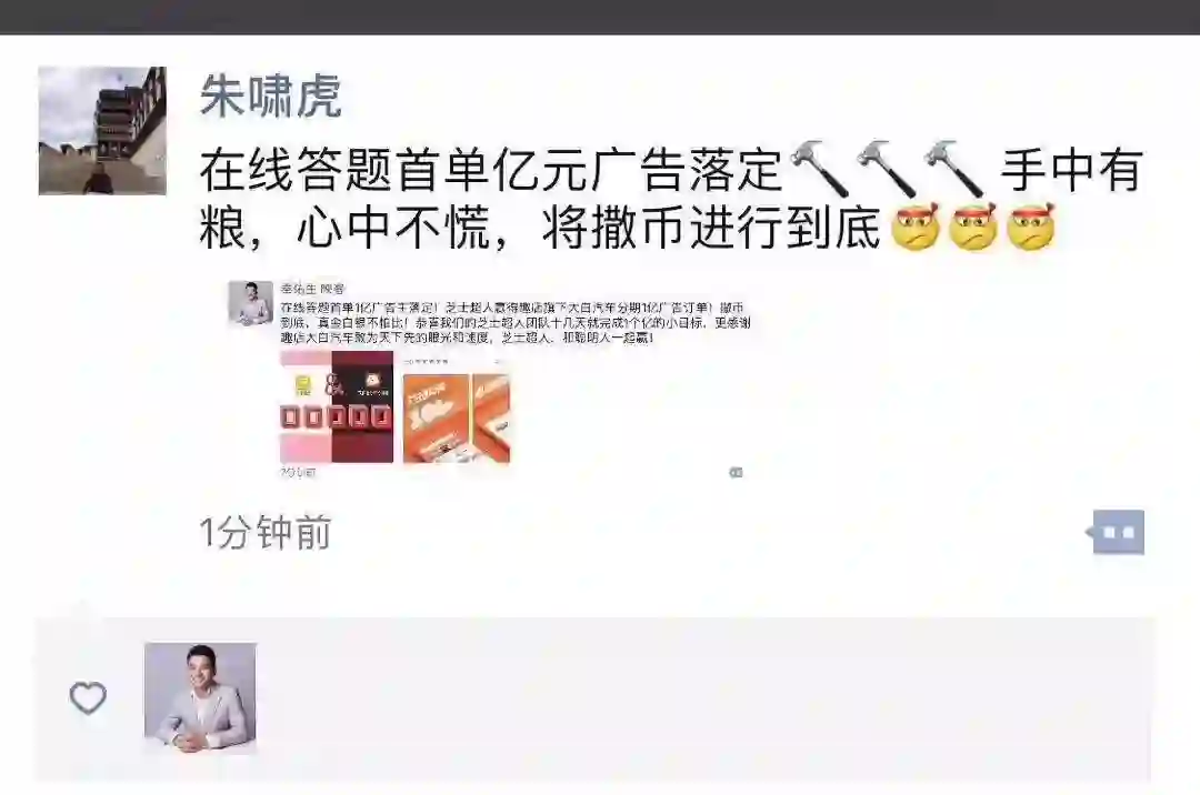 映客创始人兼CEO奉佑生发布朋友圈,宣告拿下首单广告。