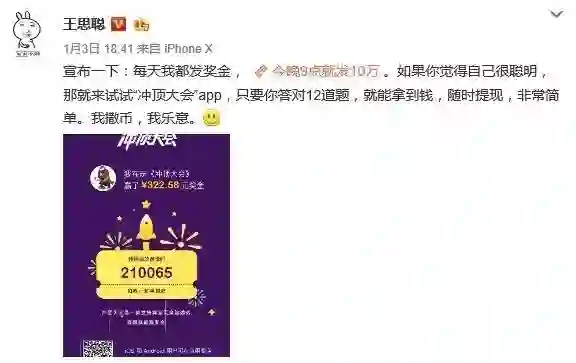 这场烧钱大战由王思聪在1月3日的一条微博点燃导火索:“每天我都发奖金,今晚9点就发10万”,并称只要用户到“冲顶大会”App答对12道题,就能拿到钱,且随时可以提现。