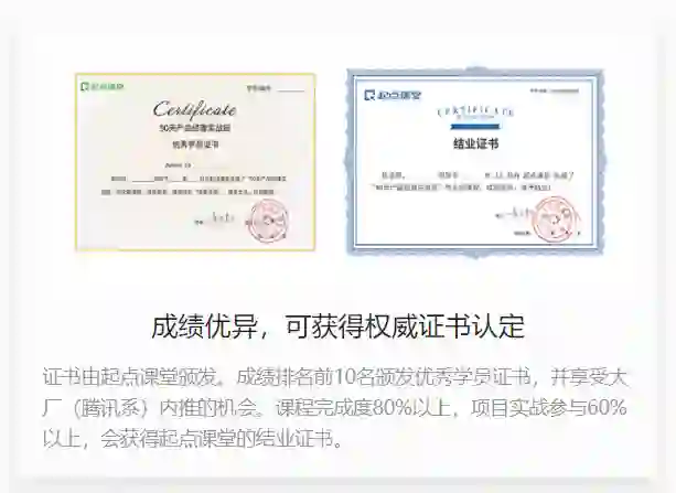 课程完成度80%以上,项目实战参与60%以上,会获得起点课堂的结业证书。