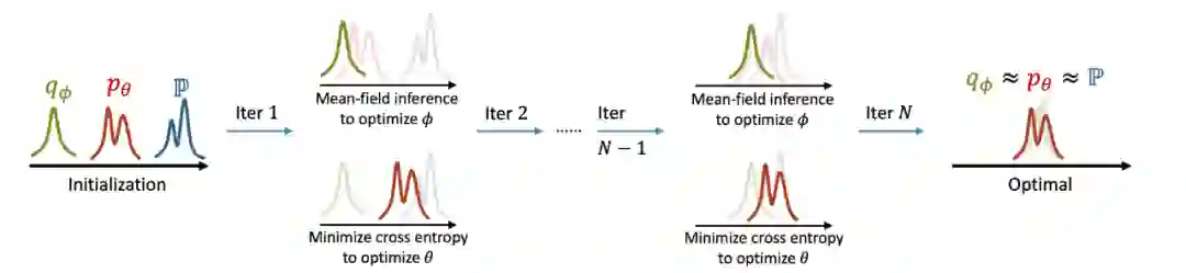 模型通过反复迭代步骤 1 和 2 来更新参数, 从而达到合作式训练变分网络 EquiNet 和能量网络的目的。这种合作学习方式的效果可以通过图 3 形象示意:在每轮迭代中,我们通过均摊变分推断来更新变分分布的参数,使其不断逼近模型