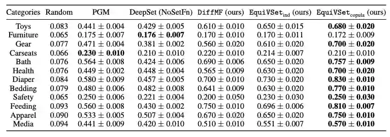1. 在商品推荐任务中,我们使用 amazon baby register dataset,该数据集包含了真实的用户购买记录。在该任务上,EquiVSet 在大部分场景中都取得最佳性能。具体地,相比于先前的 SOTA 算法 PGM,EuiVSet 的性能平均提升 33%。相比于传统的黑盒端到端子集预测方法 DeepSet(NoSetFn)(该方法相当于仅建模了变分网络 EquiNet),EquiVSet 的性能平均提升 39%,说明了显式建模集合函数的重要性。