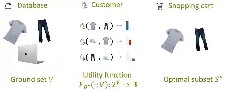 很多现实应用场景与集合密切相关,例如推荐系统、异常检测和分子筛选等。这些应用都潜在地学习了一个集合函数来评价给定集合的得分,使得输出的集合拥有最高得分。以商品推荐为例子(如下图所示),我们希望从某个网店的商品库V中推荐子集,使得用户对该商品子集拥有最高评分