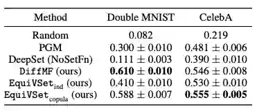 以下表格提供不同方法在该任务上的性能对比,可以看出 EquiVSet 显著优于其他方法, 并比 PGM 和 DeepSet(NoSetFn) 的性能分别平均提高 37% 和 80%。
