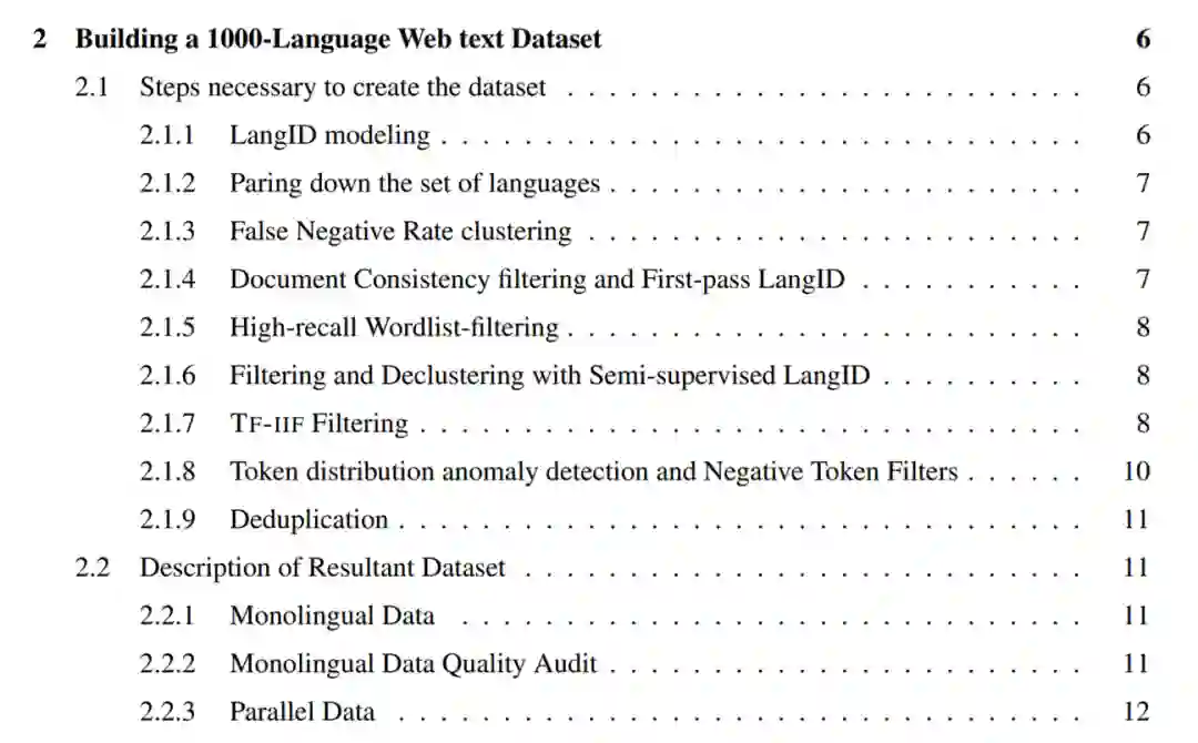 第一,通过用于语言识别的半监督预训练以及数据驱动的过滤技术,为 1500 + 语言创建了干净、web 挖掘的数据集。