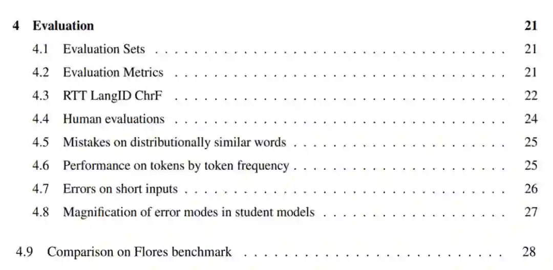 为了评估自己的机器翻译模型,研究者首先将英文句子翻译成了这些语言,为选择的 38 种长尾语言构建了一个评估集(4.1)。他们强调了 BLEU 在长尾设置中的局限性,并使用 CHRF 评估这些语言(4.2)。