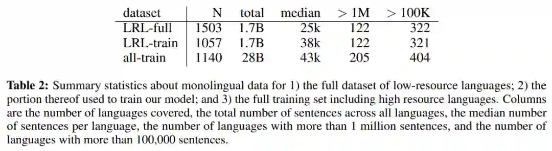 下表 2 为低资源语言(LRL)完整数据集的单语言数据、用于训练模型的部分单语言数据以及包括高资源语言在内的完整训练集的单语言数据统计。