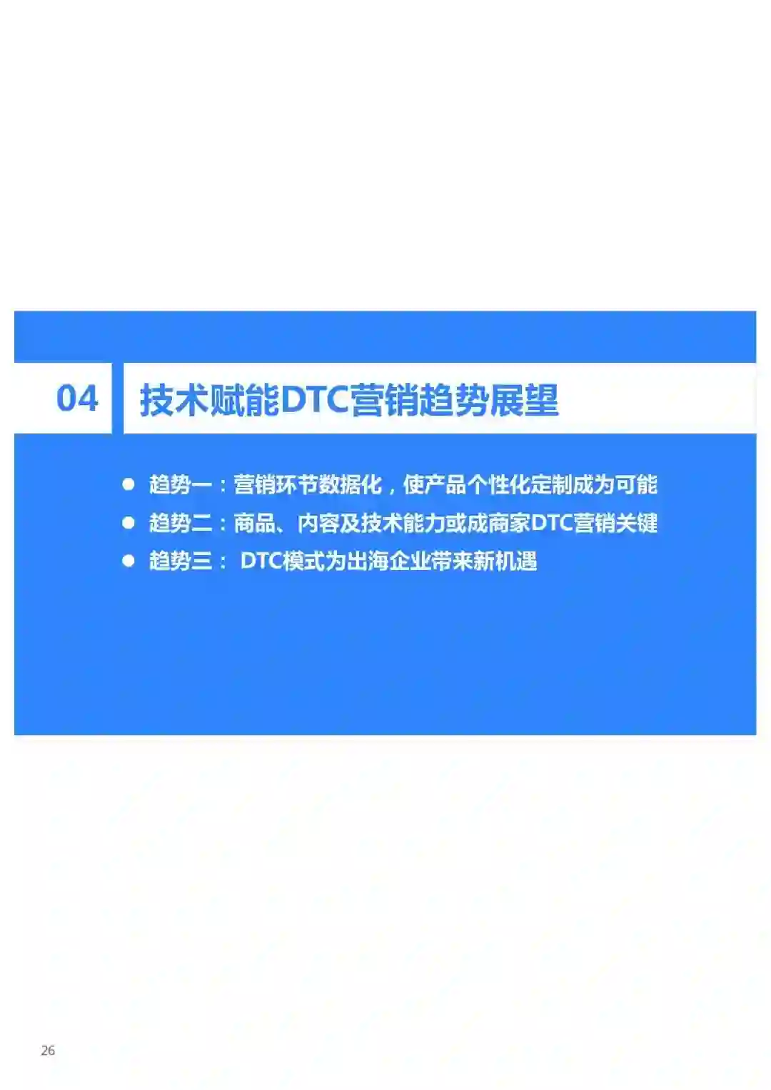 在技术不断发展的背景下,DTC营销各环节均有望实现数据化,赋能商家经营决策的同时,推动商品向个性化及定制化方向发展。随着DTC营销模式渗透率的不断提升,商家需从商品、营销内容及数据技术三方面发力,实现低成本及高效率的获客及流量转化,打造DTC营销时代的核心竞争力。