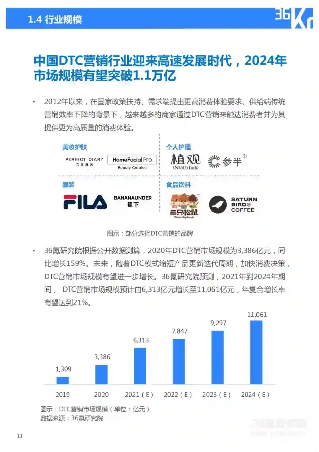 新消费时代,消费触点多元化、消费需求多样化,加之传统中心化平台营销成本持续升高,驱动商家探索更为直接而有效的营销模式,DTC营销应运而生。而各类技术的成熟与物流、支付等基础设施的不断完善,为DTC营销模式的落地应用夯实基础。此外,我国出海商家在竞争日趋激烈的市场环境下,同样开启了去中心化高效营销模式的探索,越来越多的商家拥抱DTC营销,推动行业迎来高速发展。预计2021年到2024年期间,我国DTC营销行业年复合增长率有望达到21%。2024年,行业营收或突破11,000亿元。