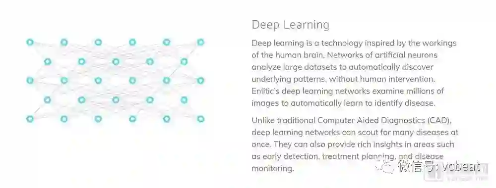 Enlitic第一次将深度学习用于胸部CT图像来自动检测肺癌结节,并且检测准确度要高于胸部放射科专家小组50%,假阴性率为0,而人类专家的假阴性率则为7%。除此之外,Enlitic还能为其是否会发展为恶性肿瘤的危险程度进行评级。