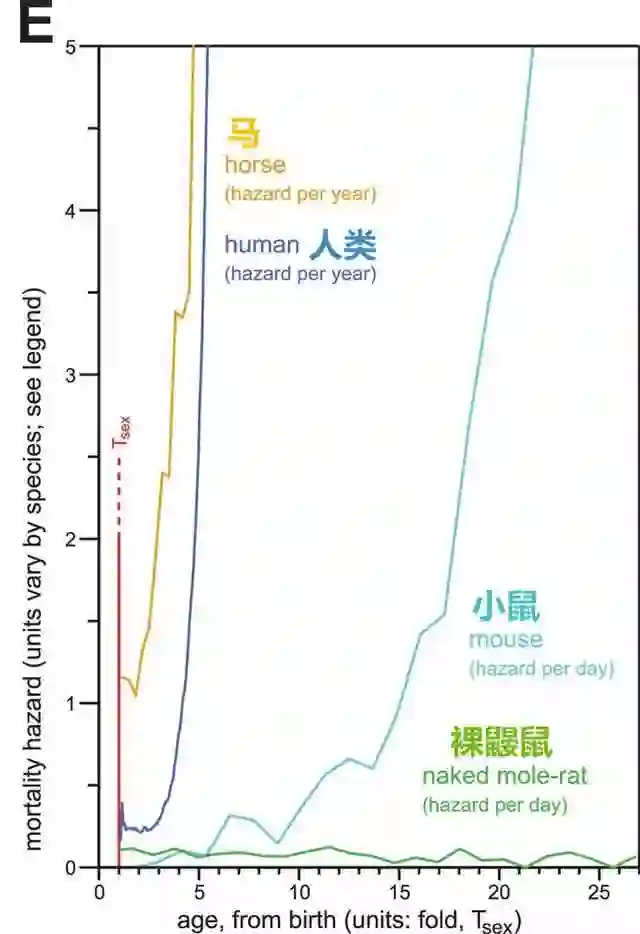 四种动物,马、人、小鼠、裸鼹形鼠在性成熟(红线Tsex)后的死亡率随年纪变化曲线。图片来源:参考资料1