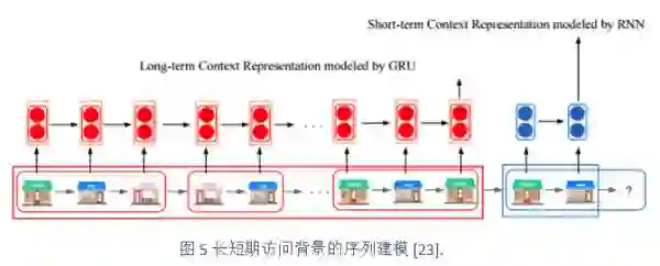 上述工作都是基于用户与物品的点对推荐模式,并没有充分考虑物品的时序关系。Hidasi等人[21]使用循环神经网络进行基于session的推荐,该工作是对于RNN的一个直接应用。Brébisson等人[22]使用神经网络模型进行解决2015年的ECML/PKDD 数据挑战题目“出租车下一地点预测”,取得了该比赛第一名。在[22]中,作者对于多种多层感知器模型以及循环神经网络模型进行对比,最后发现基于改进后的多层感知器模型取得了最好的效果,比结构化的循环神经网络的效果还要好。在[23]中,Yang等人同时结合RNN及其变种GRU模型来分别刻画用户运动轨迹的长短期行为模式,通过实验验证,在“next location”推荐任务中取得了不错的效果。如图5所示,给定一个用户生成的轨迹序列,在预测下一个地点时,直接临近的短期访问背景和较远的长期访问背景都同时被刻画。