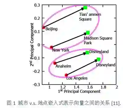 在[9]中,嵌入式表示被应用到了产品推荐中,给定一个当前待推荐的产品,其对应的生成背景(context)为用户和上一个交易的产品集合,利用这些背景信息对应的嵌入式表示向量可以形成一个背景向量,刻画了用户偏好和局部购买信息的依赖关系。然后基于该背景向量,生成当前待推荐的产品。经推导,这种模型与传统的矩阵分解模型具有很强的理论联系。在[10]中,Zhao等人使用doc2vec模型来同时学习用户和物品的序列特征表示,然后将其用在基于特征的推荐框架中,引入的嵌入式特征可以在一定程度上改进推荐效果。在[11]中,嵌入式表示模型被用来进行地点推荐,其基本框架就是刻画一个地理位置的条件生成概率,考虑了包括用户、轨迹、临近的地点、类别、时间、区域等因素。比较有趣的是,该研究中发现了类似文本中的“man-woman ≈ king-queen”等模式。图1中给出了一个“城市vs.地点”的例子,可以看到可以观察到