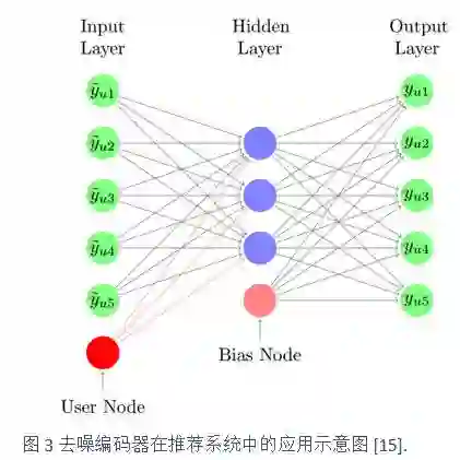较早使用神经网络模型的一个代表性工作可以追溯到NIPS 2007。Salakhutdinov等人使用限制玻尔兹曼机进行评分预测 [12]。如图2所示,其所使用的模型较为简单,具有一个两层的类二部图结构,其中用户层为隐含层 (h),可见层为用户的评分信息 (V),通过非线性关联两层上的数据信息。其中隐含层为二元变量,而用户评分信息被刻画为多项式分布变量。建立用户隐含表示信息以及其评分信息的联合能量函数,然后进行相应的参数求解。该方法的一个主要问题是连接隐含层和评分层的权重参数规模过大(对于大数据集合),也就是权重矩阵W。因此作者进一步提出使用将W分解为两个低秩矩阵,减小参数规模。值得一提的是,该工作是Ruslan Salakhutdinov和Geoffrey Hinton合作完成,其中Salakhutdinov也是Probabilistic Matrix Factorization[13]的作者。不过实验效果表明[13]中所提出的方法并没有比基于矩阵分解的方法具有显著的改进,而且参数求解使用较为费时的近似算法。在[14]中,Zhang 等人提出使用Neural Autoregressive Distribution Estimator来改进上述问题,该方法不需要显式对于二元隐含变量进行推理,减少了模型复杂度,并且使用排序代价函数来进行参数最优化。实验表明所提出的方法能够取得非常好的效果。不同于[13,14],在[15]中,Wu等人使用去噪自动编码模型(Denoising Autoencoder)进行top-N物品推荐,其输入为加入噪声的对于物品的偏好(采纳为1,否则为0),输出为用户对于物品的原始评分,通过学习非线性映射关系来进行物品预测。如图3所示,用户可见的评分数据通过加上噪音后进入输入层,然后通过非线性映射形成隐含层,再由隐含层经映射后重构评分数据。注意,该模型中加入了用户偏好表示(User Node)和偏置表示(Bias Node)。
