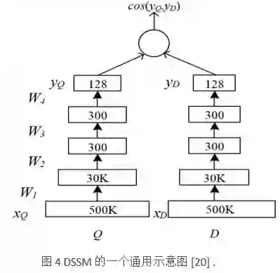 此外,还需要简要介绍一下来自微软的深度结构化语义模型(Deep Structured Semantic Models,简称为DSSM)是基于多层神经网络模型搭建的广义语义匹配模型 [19]。其本质上可以实现两种信息实体的语义匹配。基本思想是设置两个映射通路,两个映射通路负责将两种信息实体映射到同一个隐含空间,在这个隐含空间,两种信息实体可以同时进行表示,进一步利用匹配函数进行相似度的刻画。图4展示了一个DSSM的通用示意图,其中Q表示一个Query,D表示一个Document,对应到推荐系统里面的用户和物品。通过级联的深度神经网络模型的映射与变换,最终Query和Document在同一个隐含空间得到了表示,可以使用余弦相似度进行计算。DSSM最初主要用在信息检索领域,用来刻画文档和查询之间的相似度,随后被用在推荐系统中:一端对应着用户信息,另外一端对应着物品信息 [20]。以DSSM为主的这些工作的基本出发点实际上和浅层嵌入式表示模型非常相似,能够探索用户和物品两种不同的实体在同一个隐含空间内的相似性。其中一个较为关键的地方,就是如何能够融入任务特定的信息(例如物品内容信息)以及模型配置(例如可以使用简单多层神经网络模型或者卷积神经网络模型),从而获得理想的结果。