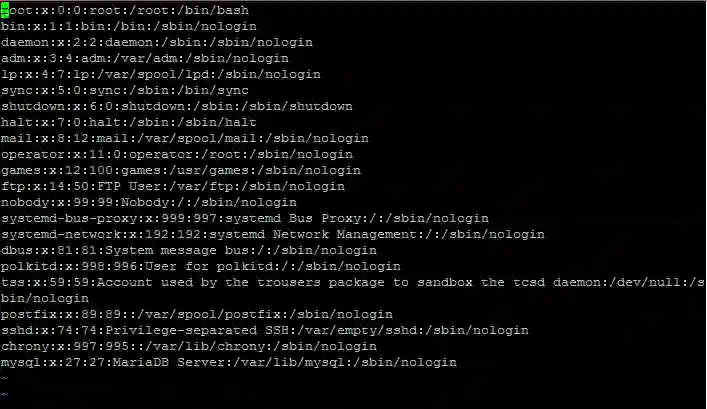 先进入到etc目录下,找到passwd文件,利用vi查看