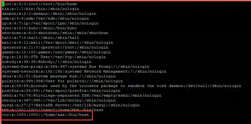 然后通过vi /etc/passwd来查看aaa这个用户是否被创建