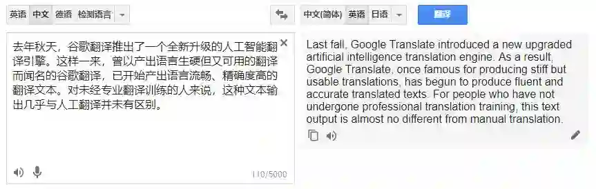去年秋天,谷歌翻译推出了一个全新升级的人工智能翻译引擎。这样一来,曾以产出语言生硬但又可用的翻译而闻名的谷歌翻译,已开始产出语言流畅、精确度高的翻译文本。对未经专业翻译训练的人来说,这种文本输出几乎与人工翻译并未有区别。我们将上面这段文字输入到谷歌翻译中(中译英),输出的英文句子,让人惊叹!
