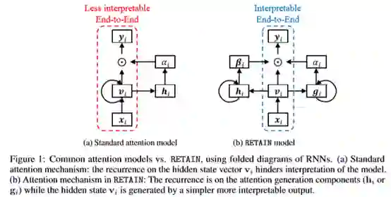 论文使用称为 RETAIN 的建模策略解决了这个限制,这是一种两级神经网络顺序数据的注意模型,提供对预测结果的详细解释保持与 RNN 相当的预测精度。为此,RETAIN 依赖于关注机制被建模以表示在遭遇期间医生的行为。一个区别 RETAIN 的功能 ( 参见图1 ) 是利用注意力生成来利用序列信息机制,同时学习可解释的表示。并模仿医生的行为,RETAIN 以相反的时间顺序检查患者的过去访问,从而促进更稳定的注意后代。因此,RETAIN 会识别最有意义的访问次数并量化访问量有助于预测的功能。