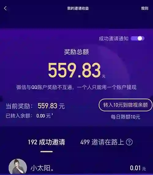 早上,松松兄弟会的一位匿名会员爆料:腾讯微视一直在大力推广的拉新活动最近把每天的佣金提现由100降到了10块,账户里面金额高的估计两年也提不完,基本就等于白干了,满满的都是套路!