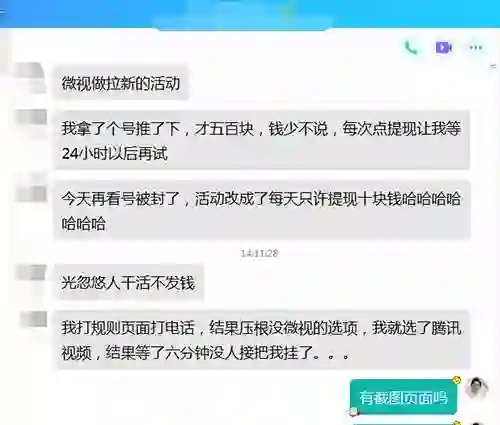 因此磊哥觉得,在最近的短视频流量凸显的环境下,腾讯也想在短视频频这块布局,分点流量,这很正常,但是一直没有火起来,所以一直在拿钱砸,大力拉新,因此也有很多网络创业者在做,但是活干了,最后在佣金提现上玩套路这就差点意思了!