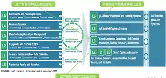 所以,从L2到L0,是指从生产控制到生产工艺的环节,这部分强调工艺的自动化。在L3生产管理的部分,则谈生产管理,从相关的MES到MOM,这层主要目的是实现制造运营的流程化。从L4两化融合到物联网赋能,这部分重在相关的工业化。