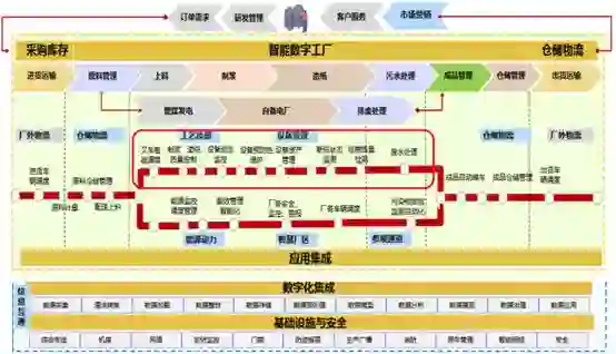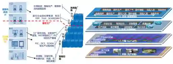 系统层级以数字工厂为核心,涉及智能制造系统层级的车间层、控制层、与设备层,也是信息化系统(IT)纵向整合工业化环境(OT),实现两化融合的重要基础。其中,工业化的环境是以数字工厂为核心,从上面车间的生产管理到下面的生产控制,再到最底层相关设备的互联互通。