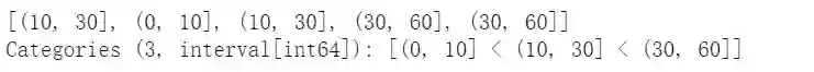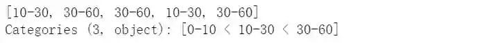 pd.cut(np.random.randint(0,60,5), [0,10,30,60], right=False, labels=['0-10','10-30','30-60'])