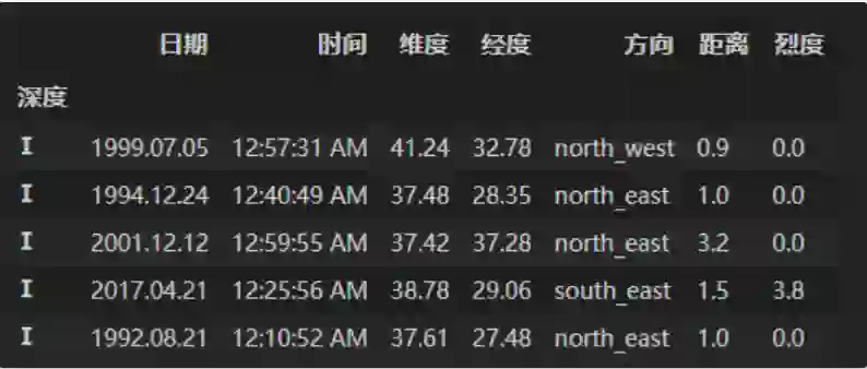df['烈度'] = pd.cut(df['烈度'],[0,3,4,5,np.inf], right=False, labels=['Ⅰ','Ⅱ','Ⅲ','Ⅳ'])df['深度'] = pd.cut(df['深度'],[0,5,10,15,20,30,50,np.inf], right=False, labels=['Ⅰ','Ⅱ','Ⅲ','Ⅳ','Ⅴ','Ⅵ','Ⅶ'])df_ds = df.set_index(['深度','烈度'])df_ds.sort_index()
