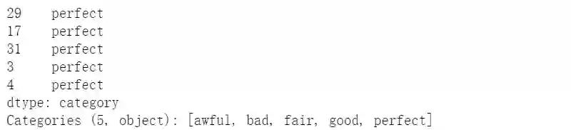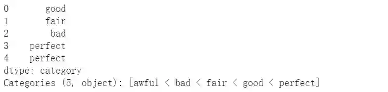 s = pd.Series(np.random.choice(['perfect','good','fair','bad','awful'],50)).astype('category')s.cat.set_categories(['perfect','good','fair','bad','awful'][::-1],ordered=True).head()