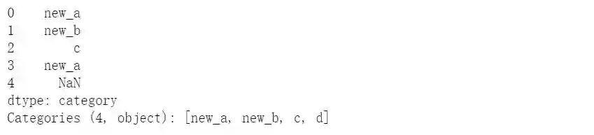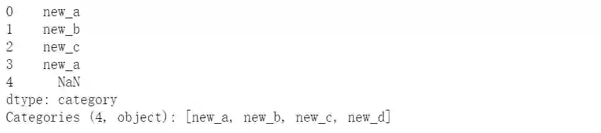 s = pd.Series(pd.Categorical(["a", "b", "c", "a",np.nan], categories=['a','b','c','d']))s.cat.set_categories(['new_a','c'])