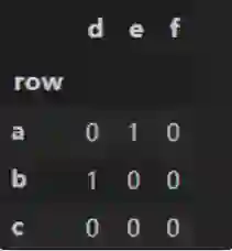 因为Categories中肯定包含出现的变量。所以将第一个参数作为index,第二个参数作为columns,建立一个DataFrame,然后把出现的变量组合起来,对应位置填入1即可。
