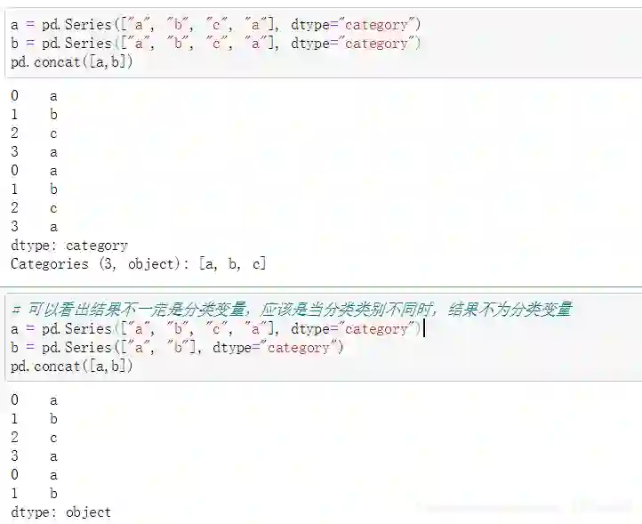 union_categoricals也适用于组合相同类别和顺序信息的两个分类。