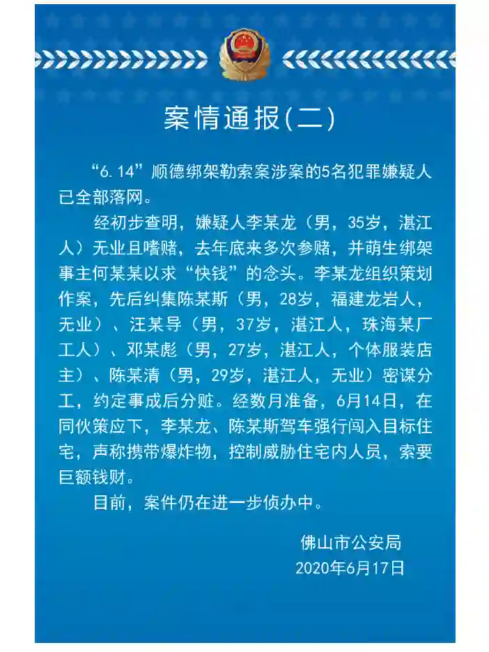 美的创始人劫持案最新进展:五名嫌疑人已全部落网