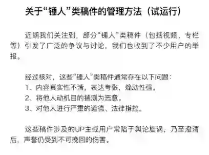 36氪获悉,6月17日,哔哩哔哩弹幕网发布了《关于“锤人”类稿件的管理方法(试运行) 》,B站表示,近期注意到部分“锤人”类稿件(包括视频、专栏等)引发了广泛的争议和讨论,即日起将升级社区规则,对争议性大的稿件和账号按程度增添争议标识,指控严重的将冻结账号。