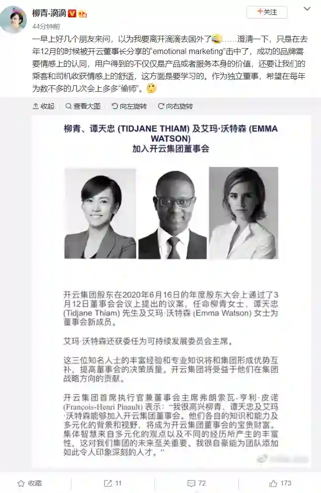 6月17日,滴滴出行总裁柳青发微博回应加入Gucci母公司开云集团董事会,称不是要离开滴滴去国外,“只是在2019年12月的时候被开云董事长分享的‘emotional marketing’击中了,成功的品牌需要情感上的认同,用户得到的不仅仅是产品或者服务本身的价值,还要让我们的乘客和司机收获情感上的舒适。作为独立董事,希望在每年为数不多的几次会上多多‘偷师’”。当地时间6月16日,开云集团宣布,滴滴出行总裁柳青、英国演员艾玛·沃特森、瑞士信贷前首席执行官蒂贾恩·蒂亚姆加入集团董事会。