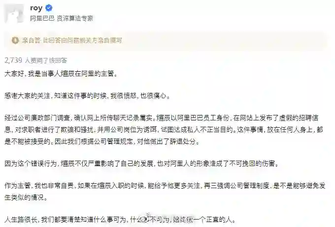 阿里P8招聘私人助理当事人领导发文称,经过阿里廉政部门调查,确认网上所传聊天记录属实。煊辰以阿里巴巴员工身份,在网站上发布了虚假的招聘信息,对求职者进行了欺骗和骚扰,并用公司岗位为诱饵,试图达成私人不正当目的。这件事情,放在任何人身上,都是不能被接受的。因此阿里根据公司管理规定,对他做出了辞退处分。(新浪科技)
