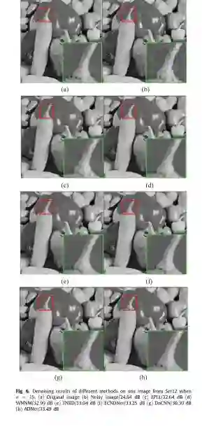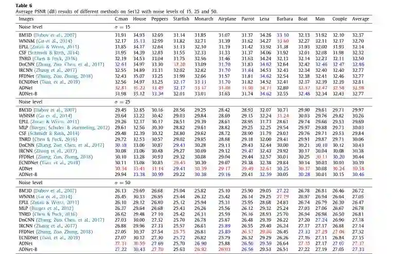 5.不同方法在Set12数据库上对于15,25和50的噪声级别的平均PSNR (dB)