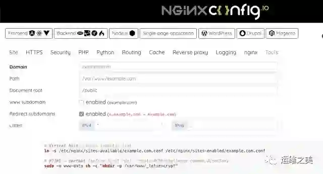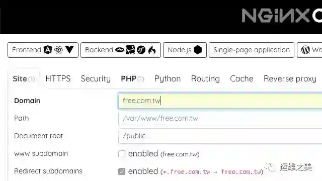 依照 NGINXConfig 说明,这个工具可以设定的项目包括网站基本选项、HTTPS、安全相关选项、PHP、Python、Routing、Cache、Reverse Proxy、Logging 等等。 NGINXConfig 已经内建几种常用的架站项目,例如:前后端、Node.js、单页面应用程序、WordPress、Drupal 和 Magento,点选后可针对该项需求先启用特定的配置选项。