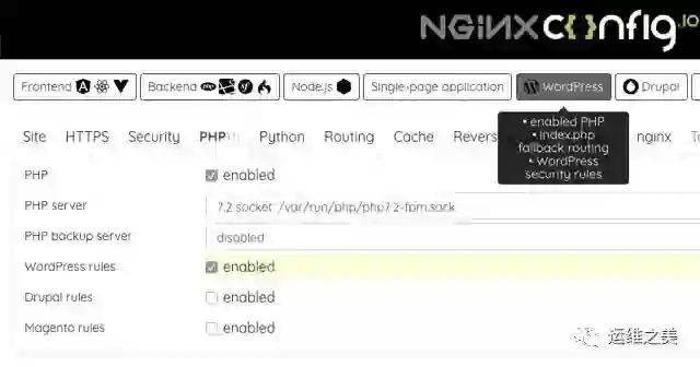 如果 Nginx 网页服务器要拿来运行特定程序,NGINXConfig 也提供一些选项,点选后就会预先选取所需的相关功能,例如选取 WordPress 后会启用 WordPress 规则。