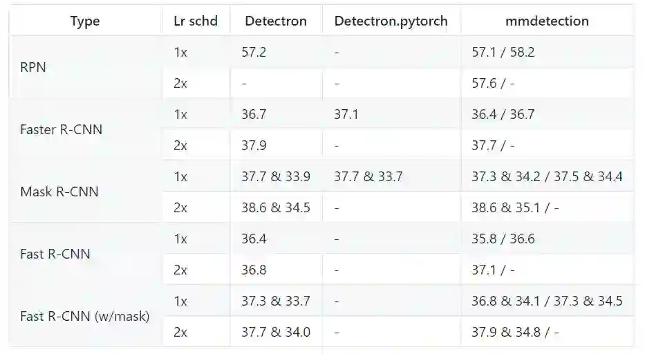 具体说说上面提到的三个方面吧。首先是 performance,由于 PyTorch 官方 model zoo 里面的 ResNet 结构和 Detectron 所用的 ResNet 有细微差别(mmdetection 中可以通过 backbone 的 style 参数指定),导致模型收敛速度不一样,所以我们用两种结构都跑了实验,一般来说在 1x 的 lr schedule 下 Detectron 的会高,但 2x 的结果 PyTorch 的结构会比较高。