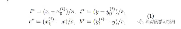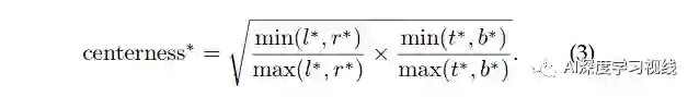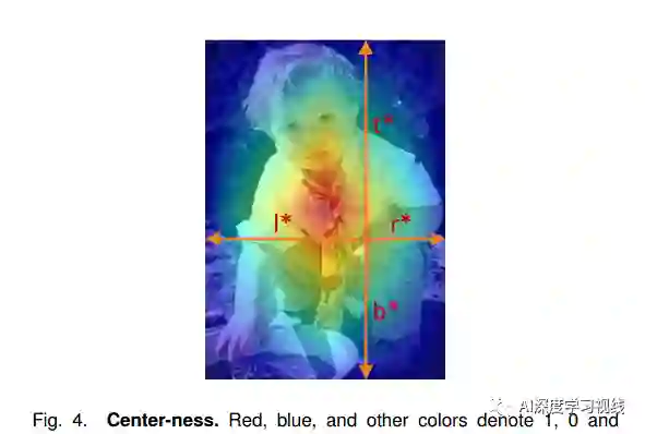 除了用于分类的标签,我们还有一个4D实向量t∗= (l∗,t∗,r∗,b∗)作为位置的回归目标。这里,l∗,t∗,r∗和b∗是该位置到包围框四面的距离,如图1(左)所示。