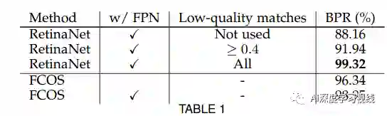 可以看出FCOS与anchor_based的RetinaNet的BPR已经很接近了。