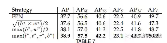 max(l∗,t∗,r∗,b∗)≤mi-1 或者 max(l∗,t∗,r∗,b∗)≥mi,它被设置为负样本,因此不再需要返回一个边界框。这里mi是feature level需要返回的最大距离。在本文中,m2,m3,m4,m5,m6,m7的取值分别为0,,64,,128,256,512,∞。