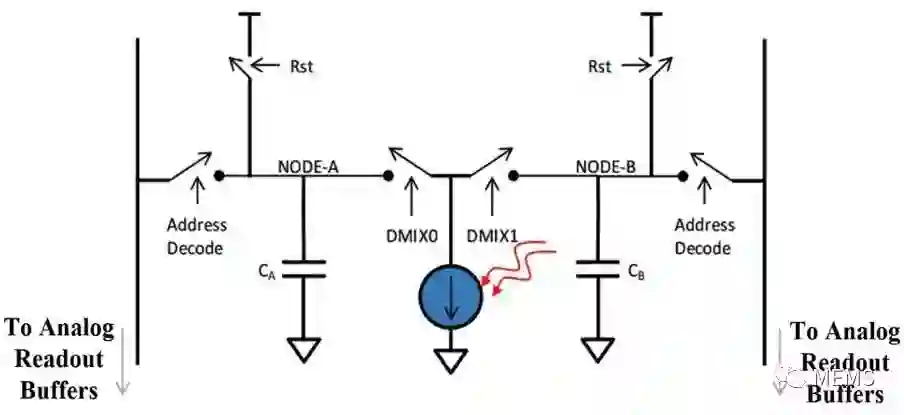 上图显示了每个像素中包括两个电荷存储电容器的CMOS图像传感器,切换两个电荷存储电容器的连接以记录入射光