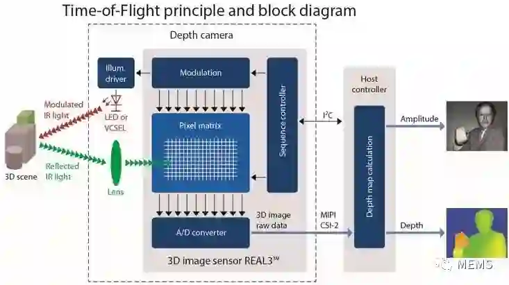 ToF传感器测量光在某介质中行进一段距离所需的时间。通常,这是对脉冲发射光到达物体并反射回到ToF传感器所用时间的测量。ToF摄像头则利用ToF测量原理(ToF图像传感器)来确定摄像头与物体或周围环境之间距离,并通过测量的点生成深度图像或3D图像。