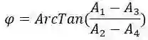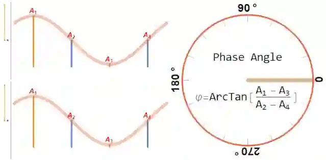 在此解释下测量值和相位角之间的关系。A1和A3的差值与A2和A4的差值的比等于相位角的正切值。ArcTan实际上是双变量反正切函数,可映射至适当的象限,当A2=A4并且A1>A3或A3>A1时,分别定义为0°或180°。