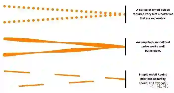 上图顶部表达了第一种方法,发射脉冲光并测量它们经反射后返回的时间间隔。