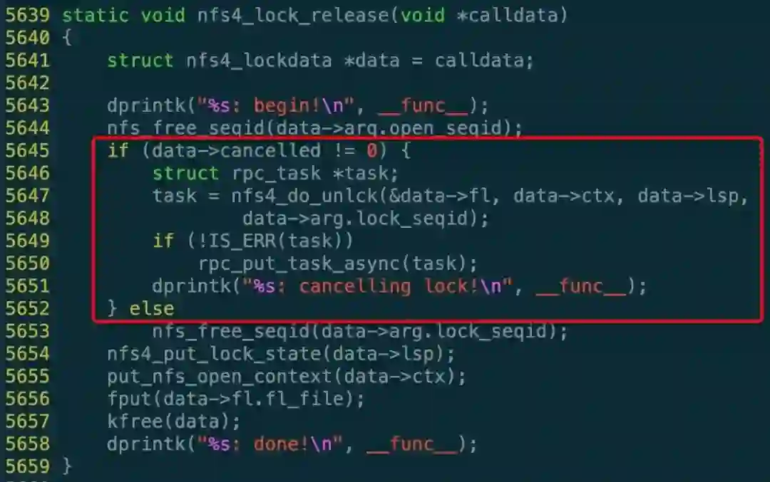 实现可知,当ret < 0时,表明获取锁过程被信号中断,并使用 struct nfs4_lockdata 的 cancelled 成员记录。继续查看rpc_task完成后释放时的回调函数